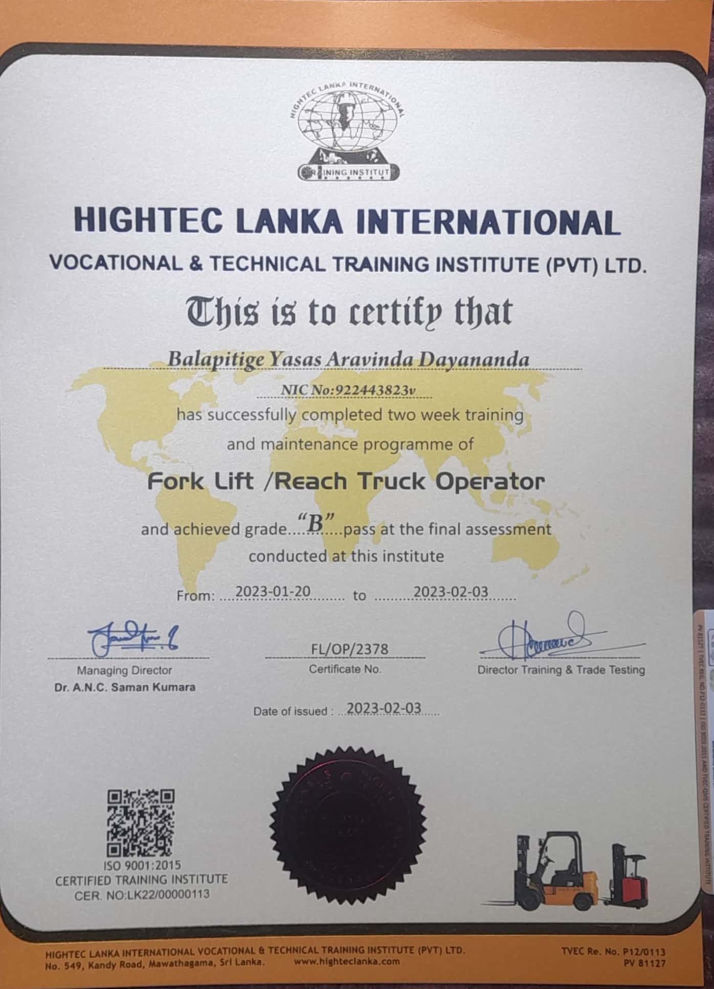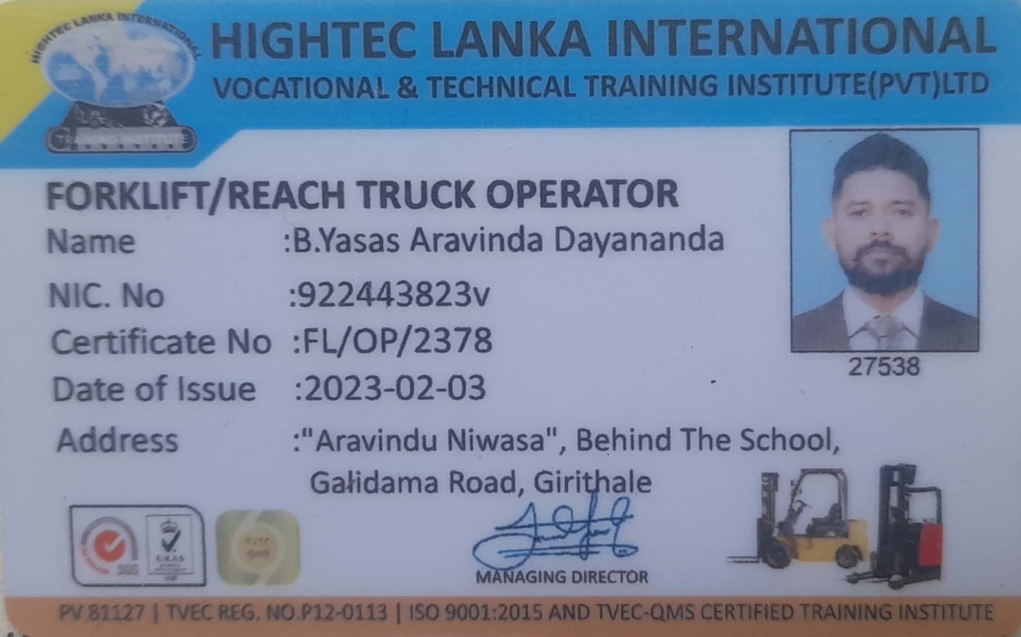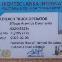 I’m Yasas Aravinda From Polonnaruwa.I would like to join as Forklift operator for any country.I have Two years of work experience and Hightec Lanka institute certificate and NVQ Level 03 certificate.My CV and Passport, certificates are attached herewith.I am looking for a job locally or abroad for this.