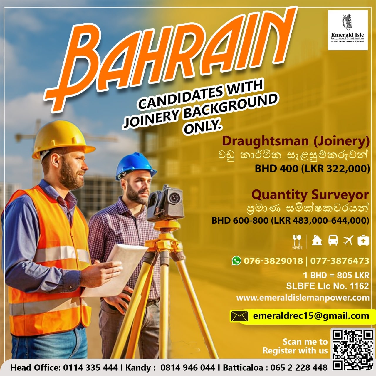 Emerald Isle Manpower stands among Sri Lanka’s most trusted overseas recruitment agencies. With extensive industry experience, we connect skilled Sri Lankan workers with globally recognized employers. We ensure a transparent recruitment process, providing complete guidance before, during, and after deployment. Therefore, professionals applying for Bahrain joinery jobs can confidently rely on our agency for safe, rewarding, and career-enhancing opportunities.