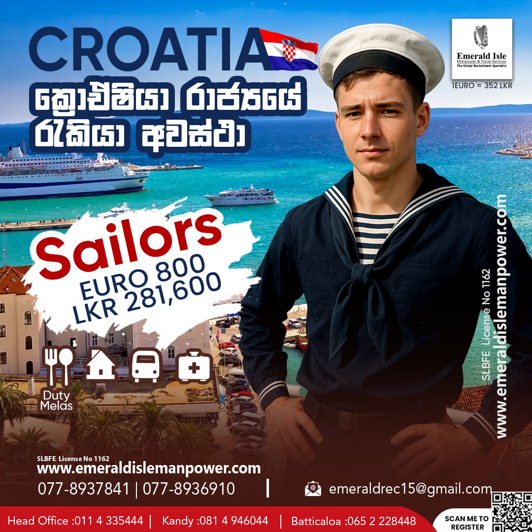 The current vacancy is specifically for the role of a Sailor. This position offers a competitive monthly salary package of EUR 800, which is approximately LKR 281,600. This attractive remuneration package ensures that professionals are rewarded fairly for their commitment and expertise. Furthermore, all work is conducted in Croatia, a premier European destination, offering immense professional exposure and life experience.