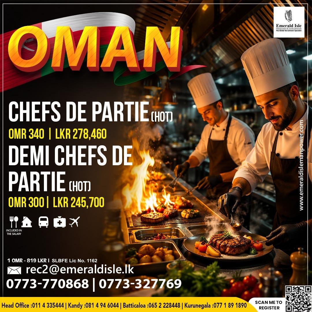 • Chefs De Partie (Hot Kitchen): Candidates for this role will receive a monthly salary of OMR 340, which converts to approximately LKR 278,460.