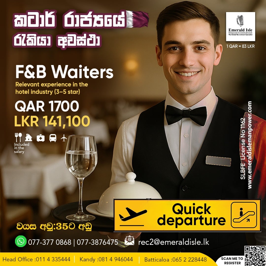 The position is based in Qatar, one of the most sought-after destinations for hospitality professionals. Selected candidates will work with a 3–5-star hotel, providing full-time service in the Food and Beverage department. The offered salary is QAR 1,700 (approximately LKR 141,100). In addition, the employer covers accommodation, transportation, medical services, and air tickets. Meals are included within the salary package.