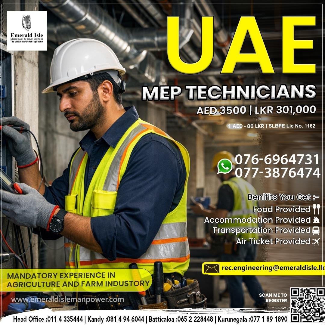 The current opening for MEP Technicians offers a competitive salary of AED 3500, which converts to approximately LKR 301,000 based on current exchange rates. This role serves as a gateway to gaining international experience while working for a reputable organization in the UAE.