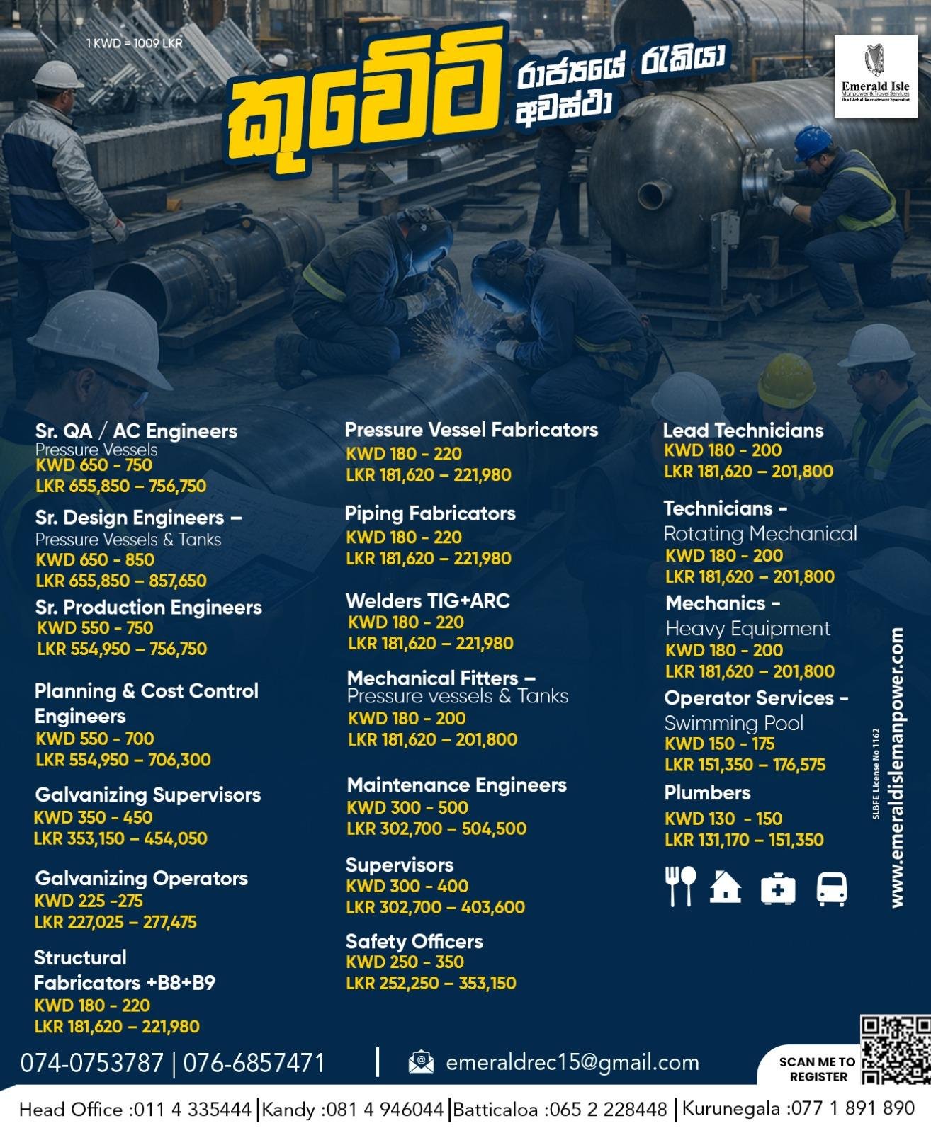 - Fabrication and Welding: Pressure Vessel Fabricators, Piping Fabricators, and TIG+ARC Welders (KWD 180 – 220).
