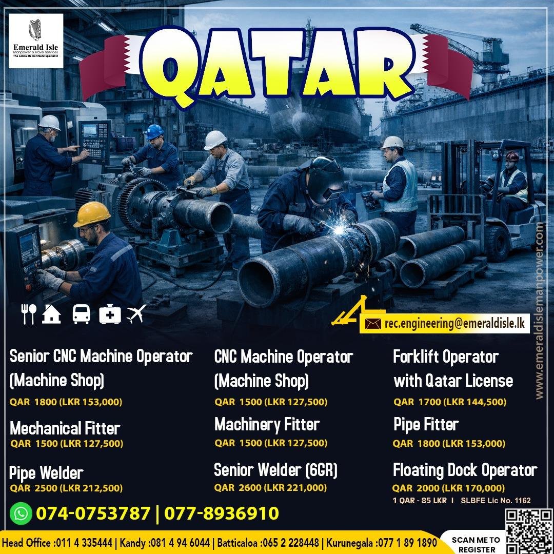 - Senior CNC Machine Operator & Pipe Fitter: QAR 1800 (Approx. LKR 153,000)