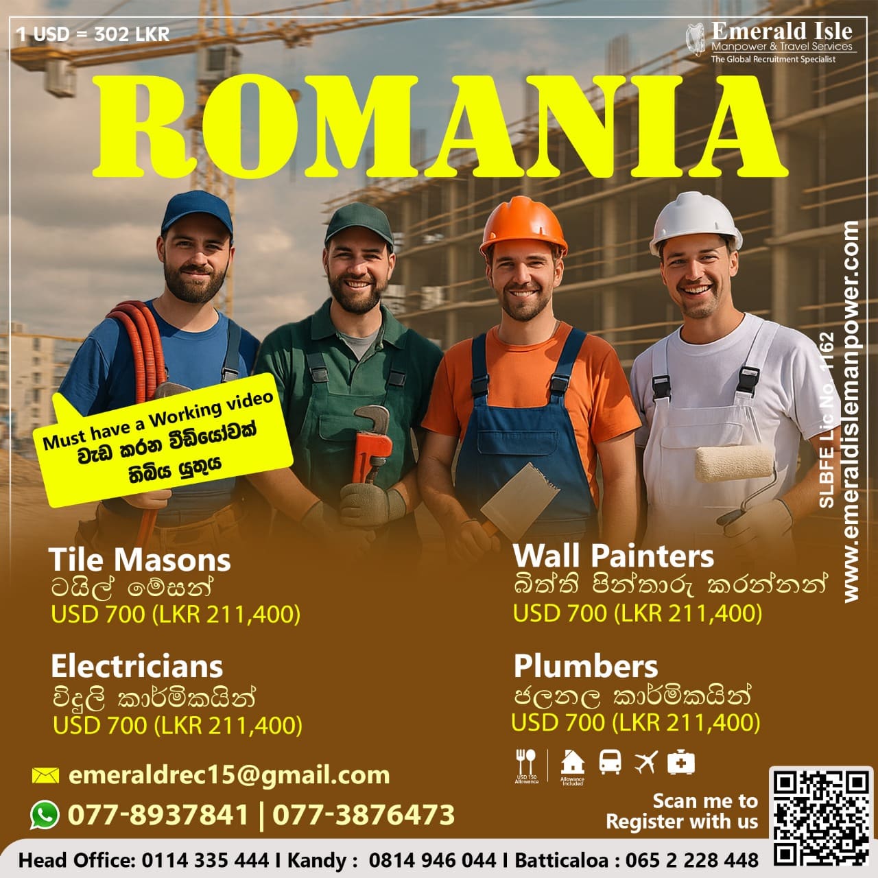 Emerald Isle Manpower proudly announces excellent job opportunities in Romania for skilled professionals in the construction industry. This recruitment aims to connect hardworking Sri Lankan tradesmen with reliable European employers offering attractive salaries and long-term career prospects. The available roles include Plumbers, Electricians, Wall Painters, and Tile Masons, each providing an ideal opportunity for candidates seeking a stable overseas career.