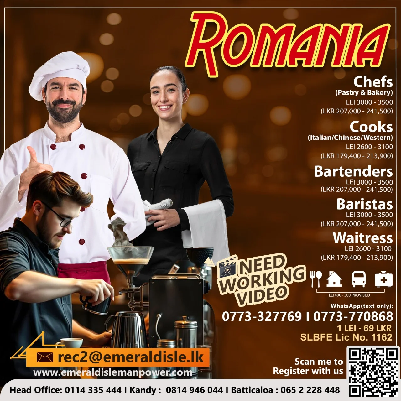 Specifically, our client seeks experienced personnel for multiple specializations. We require highly skilled Chefs (Pastry & Bakery), Bartenders, and Baristas, offering salaries between LEI 3000 and 3500 (LKR 207,000 – 241,500). Cooks (Italian, Chinese, Western) and Waitresses will earn LEI 2600 to 3100 (LKR 179,000 – 213,900). Consequently, applicants match their expertise to the most suitable role.