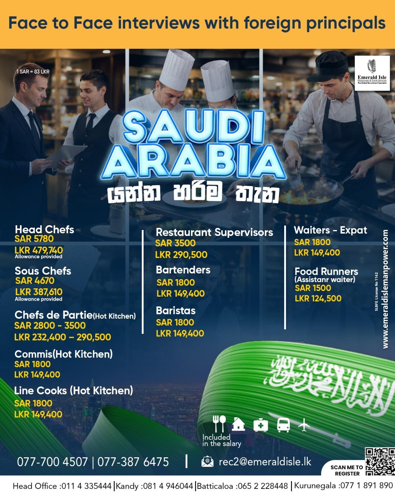 Emerald Isle Manpower and Travel Services presents an exclusive opportunity for hospitality professionals to advance their careers through face-to-face interviews with foreign principals from Saudi Arabia. We are currently recruiting skilled individuals to join prestigious establishments in the Middle East. This recruitment drive aims to fill various positions within the culinary and service departments, offering candidates a platform to showcase their expertise in a dynamic, international environment. Consequently, this initiative serves as a gateway for Sri Lankan talent to gain global exposure while earning competitive compensation.
