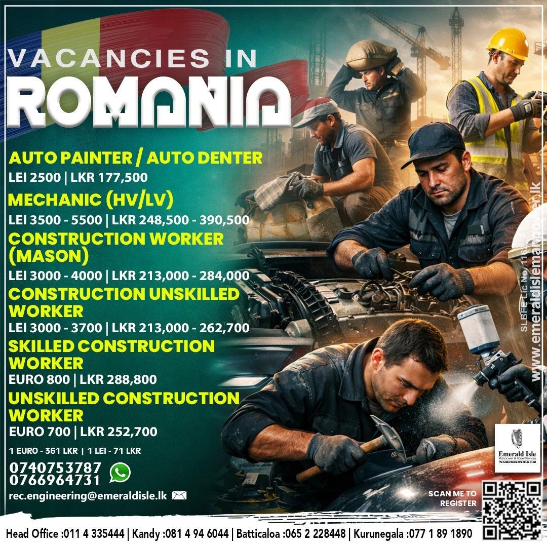 Emerald Isle Manpower is currently facilitating a major recruitment drive for a prestigious client in Romania. This project offers skilled and unskilled Sri Lankan workers the opportunity to enter the European labor market through stable, high-demand roles. The employer specifically seeks dedicated individuals who possess the technical expertise or physical stamina required for modern construction and automotive maintenance projects. By joining this initiative, workers can enhance their professional profiles while contributing to Romania’s rapidly growing infrastructure and service sectors.